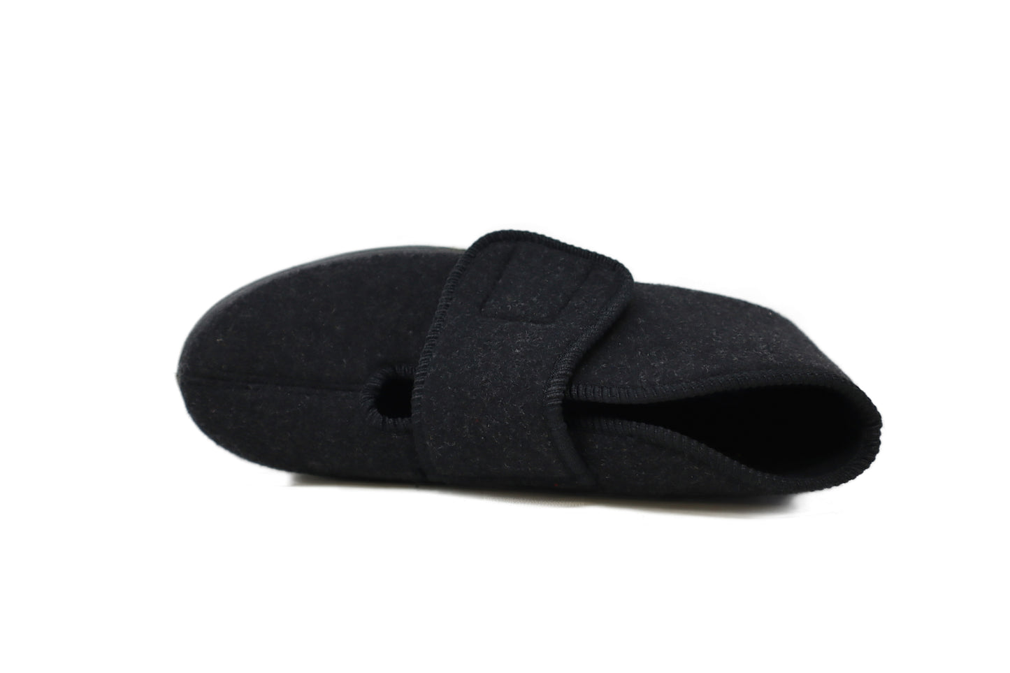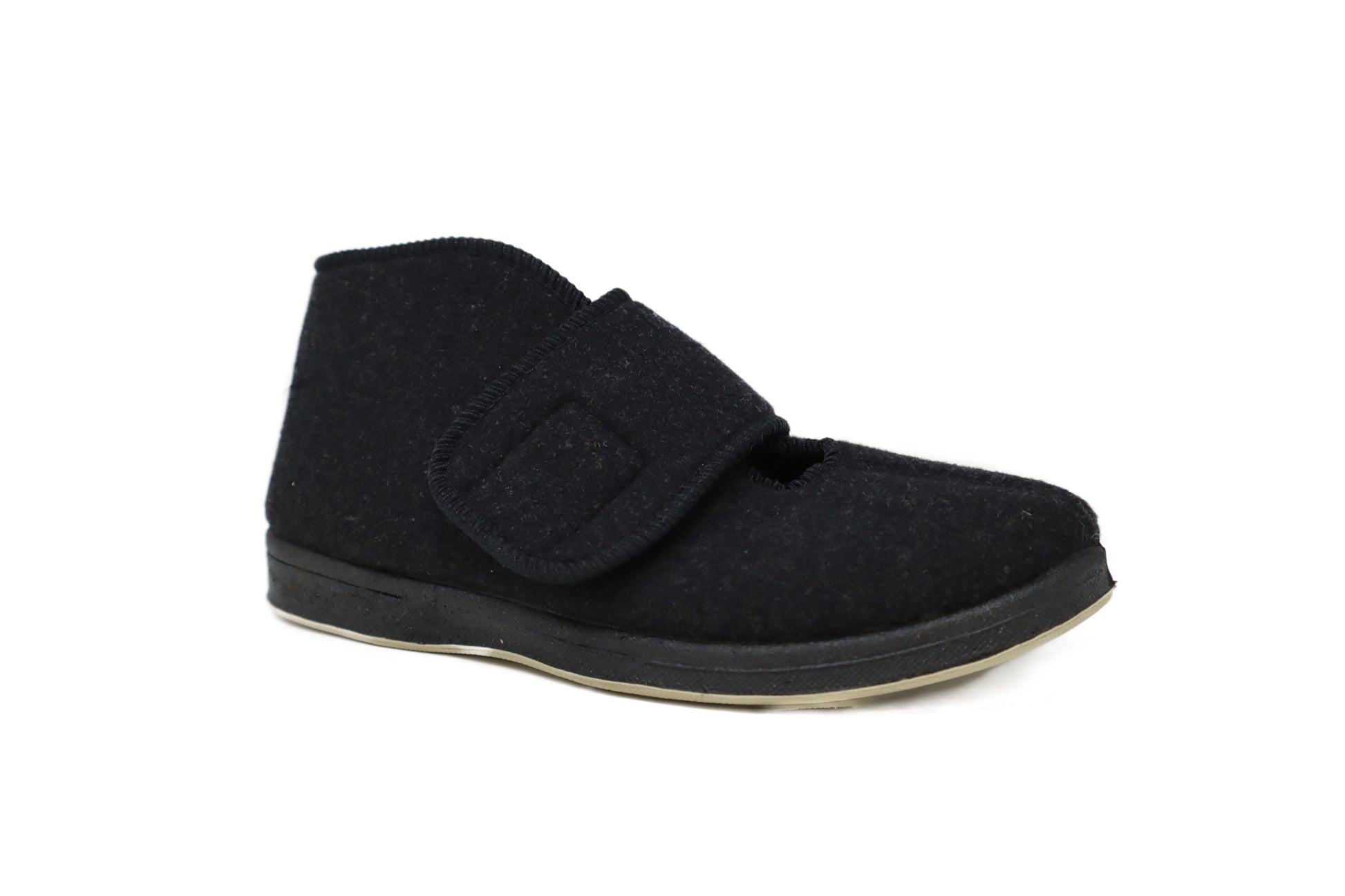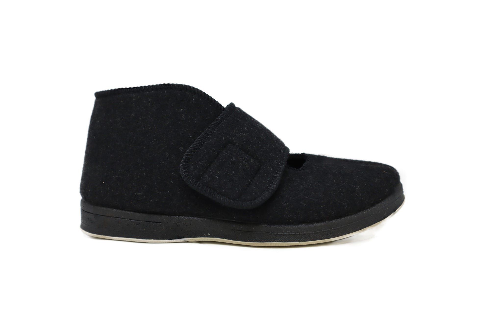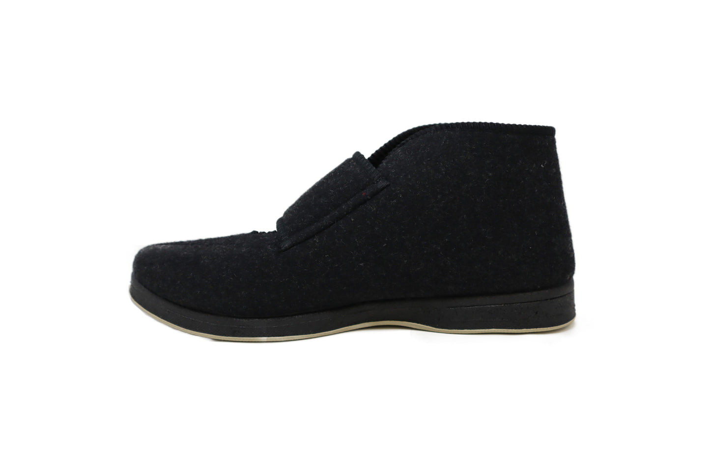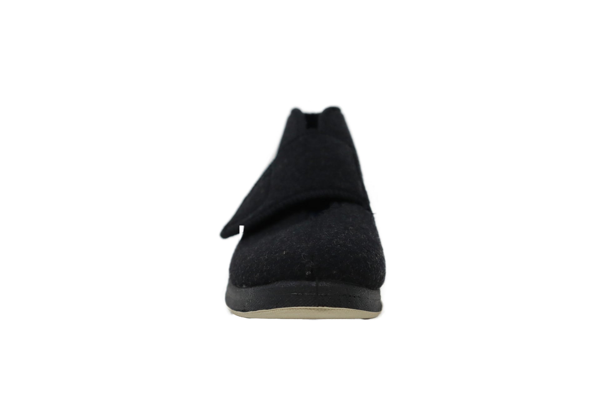 Recommended by leading podiatrists and nursing home care professionals, this bootie slipper features an adjustable closure strap for an extra wide fit and easy on / off. The soft, durable wool upper keeps your feet comfortably warm. The non-marking 100% rubber outsole provides traction and durability for indoor and outdoor wear.