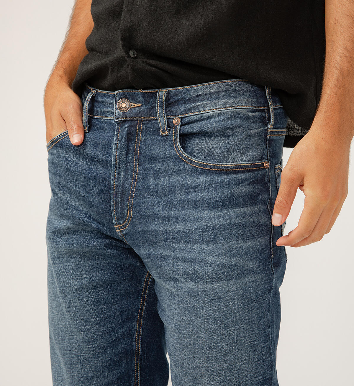 •Straight leg jeans with a dark eco indigo rinse that uses less water, chemicals and energy