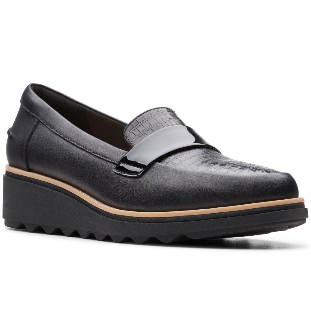 Blended with style and comfort, these teen girls' Clarks Sharon Gracie black/tan penny loafers are a must-have for casual days around the town. Boasting of durable leather upper, these wedge slip-ons have a round toe front, smooth fabric lining, moisture-wicking OrthoLite® footbed with CushionSoft padding and a lightweight EVA outsole with traction-enhancing texture.